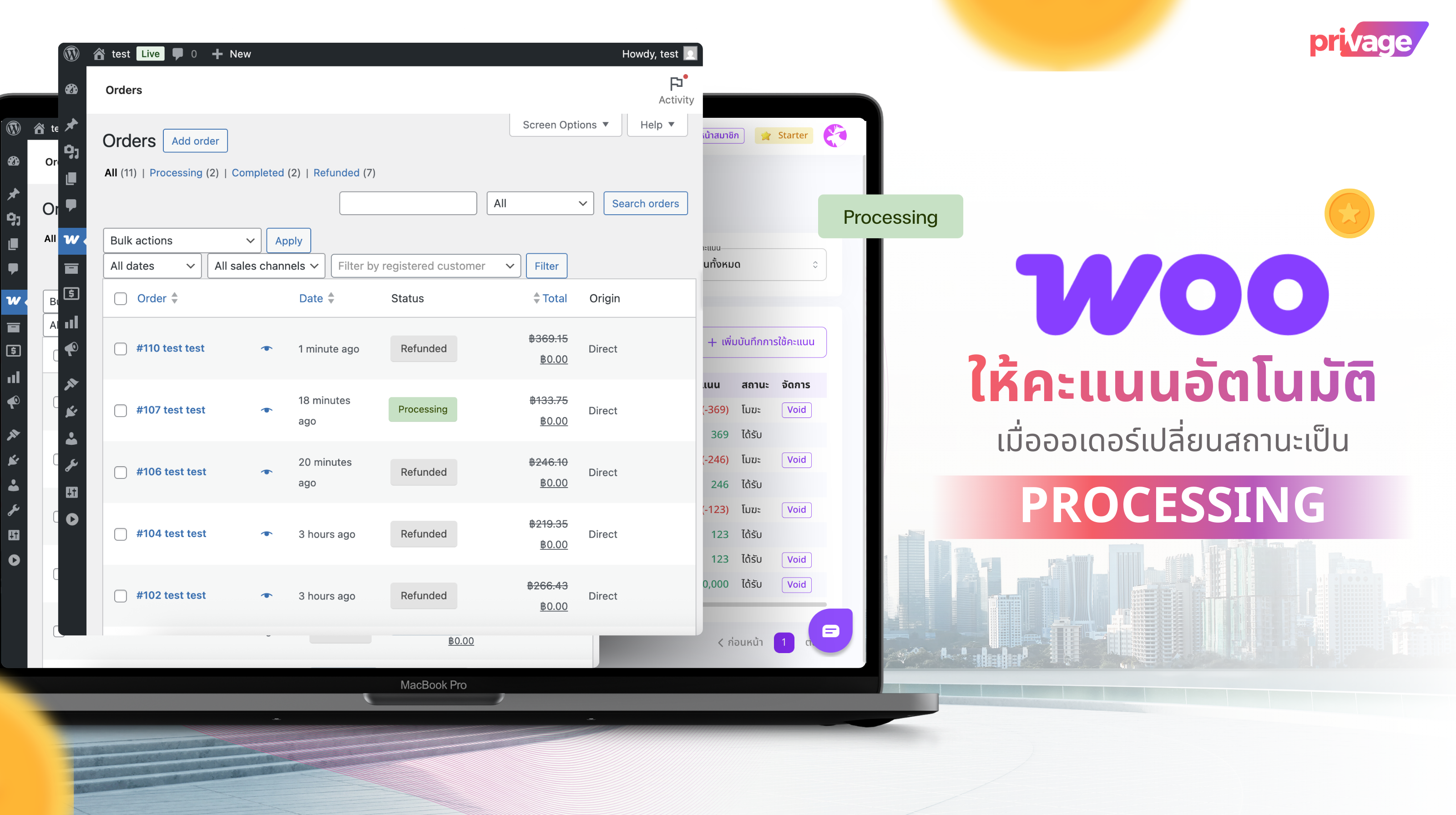 Woo Commerce ถือเป็น Plugin E-Commerce ของ Wordpress ที่ได้รับความนิยมอย่างมากในการเปิดเว็บไซต์เพื่อให้สมาชิกสามารถซื้อของออนไลน์ได้ แอปฯนี้ จะช่วยให้ธุรกิจของคุณสามารถเชื่อมต่อระหว่างระบบ CRM ของพริเวจ และ Woo Commerce สามารถให้คะแนนอัตโนมัติหลังจากสิ้นสุดการขายได้อย่าง Real time โดยเมื่อยืนยันการชำระเงินและเตรียมจัดส่ง (Processing) ระบบจะส่งข้อมูล
