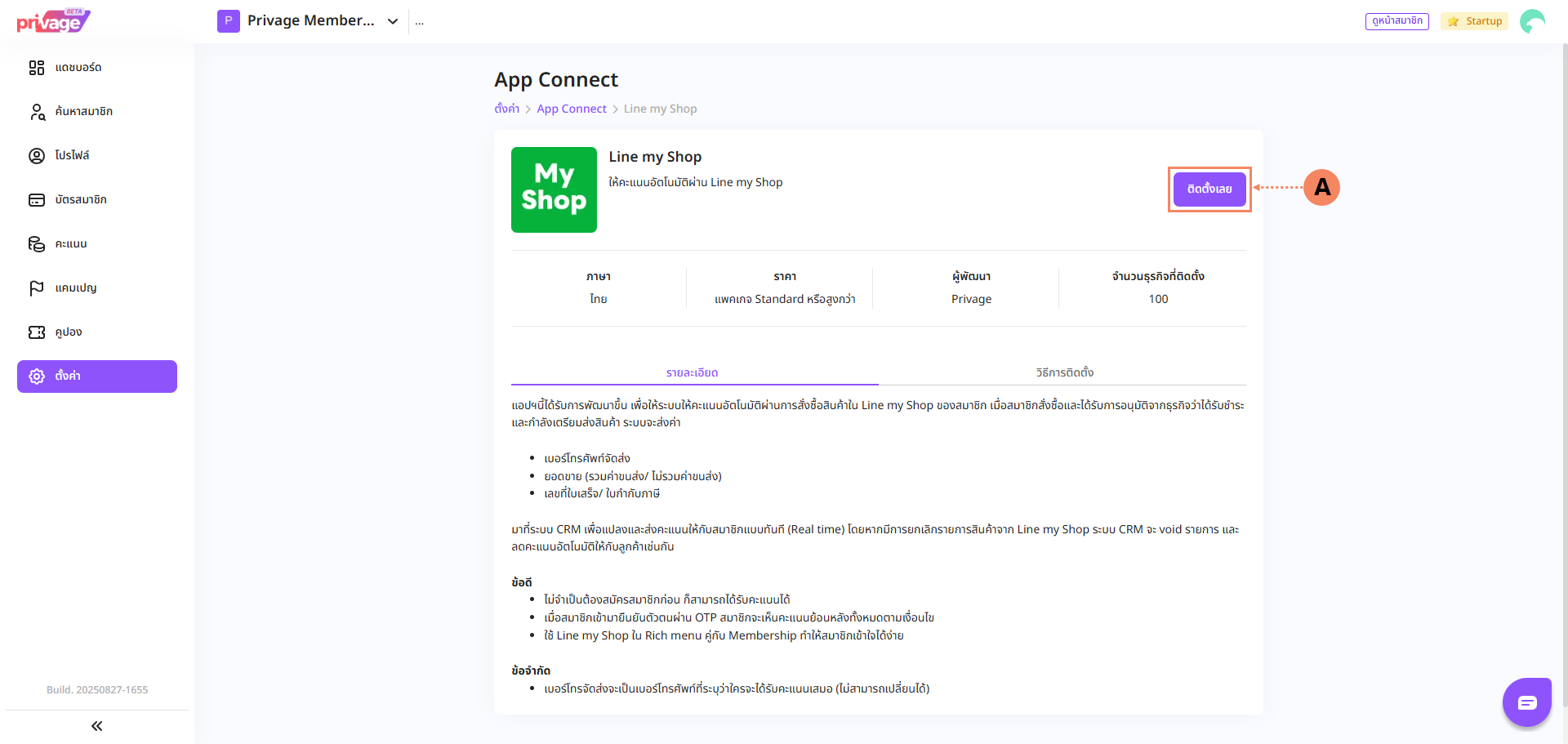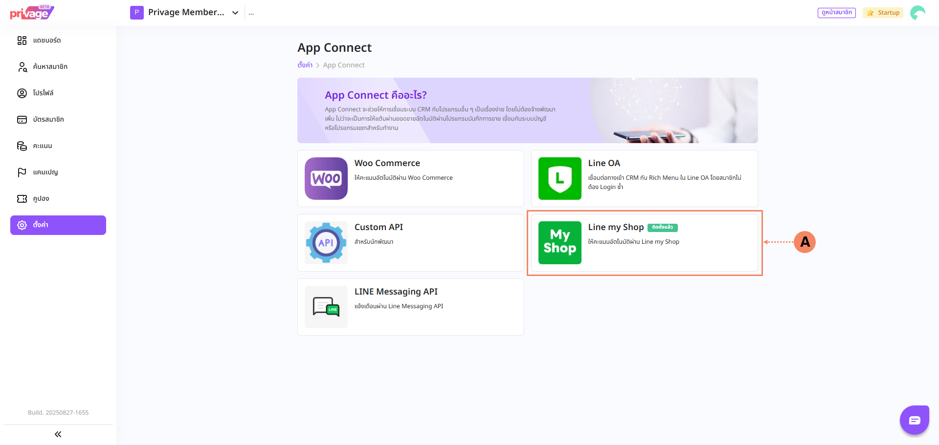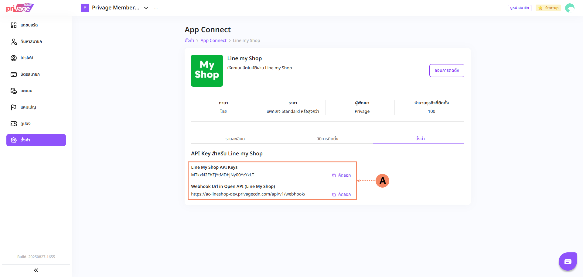 2.5 ระบบจะทำการ Genarate API KEY ให้กดปุ่ม คัดลอก (A) เพื่อนำไปใช้สำหรับติดตั้ง Line MyShop ในระบบ Privage