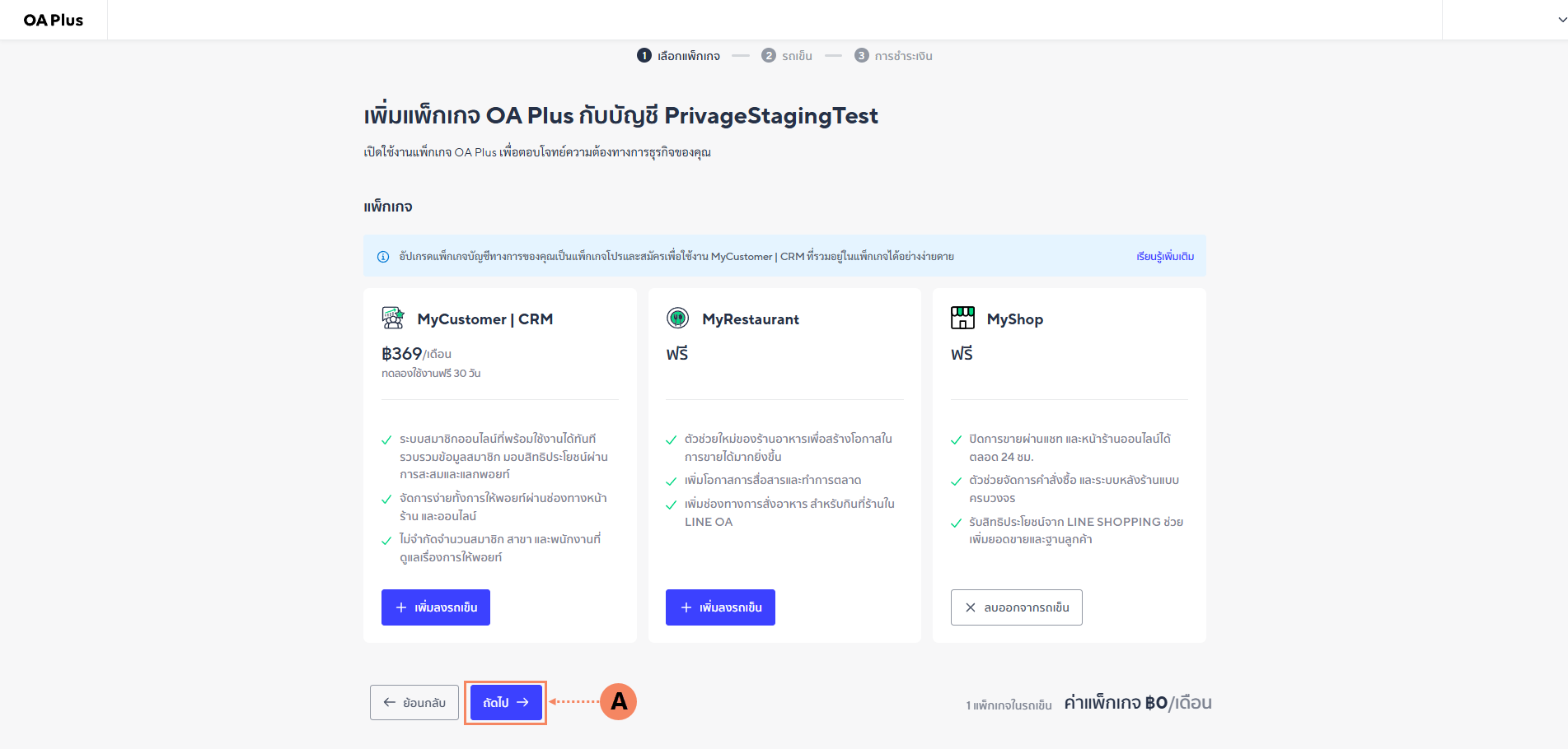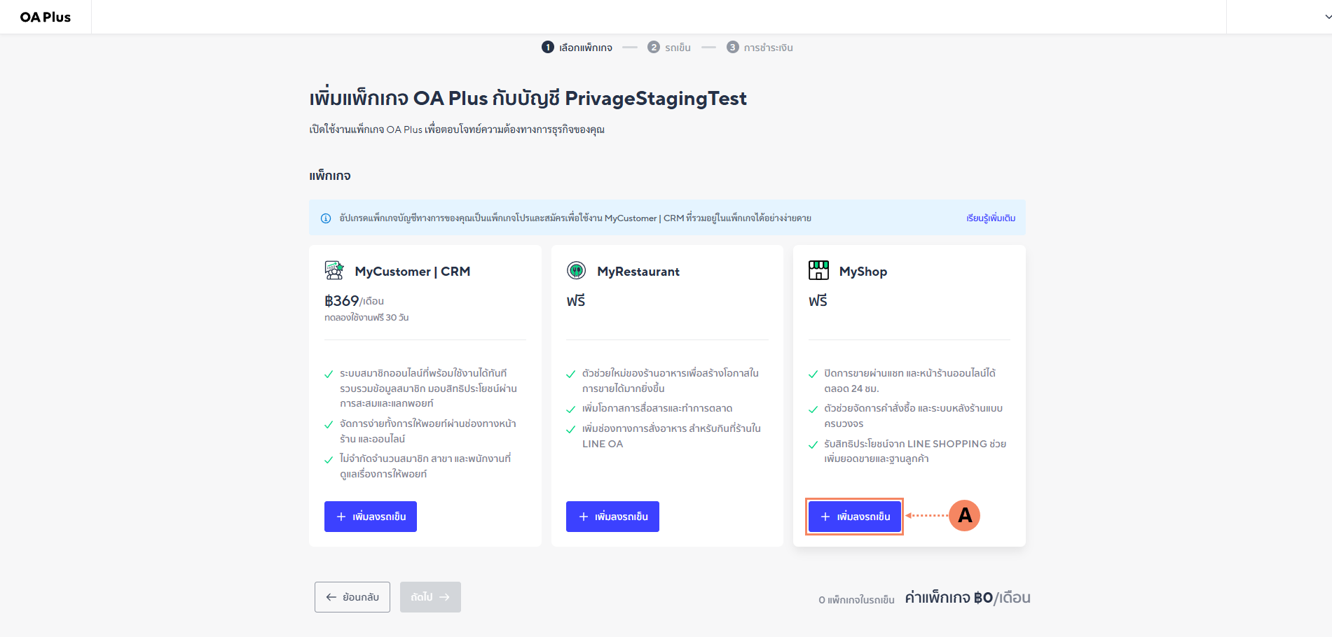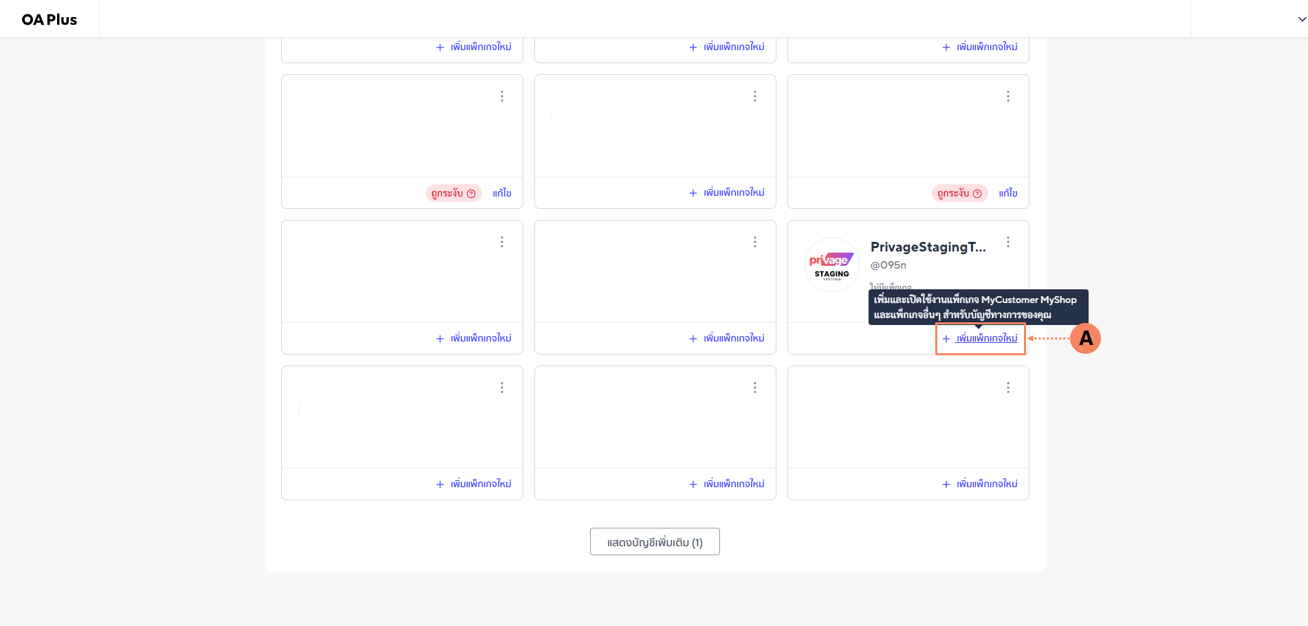 1.2 กด เพิ่มแพ็กเกจใหม่ (A) ใน Line Official ที่ต้องการเปิดใช้งาน Line MyShop