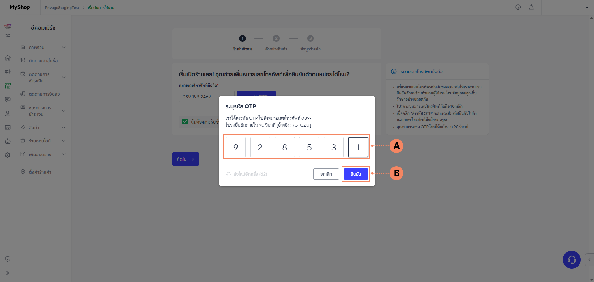 1.9 กรอกรหัส OTP (A) ที่ได้รับ จากนั้นกดปุ่ม ยืนยัน (B) เป็นเสร็จขั้นตอนการเปิดใช้งาน Line My Shop
