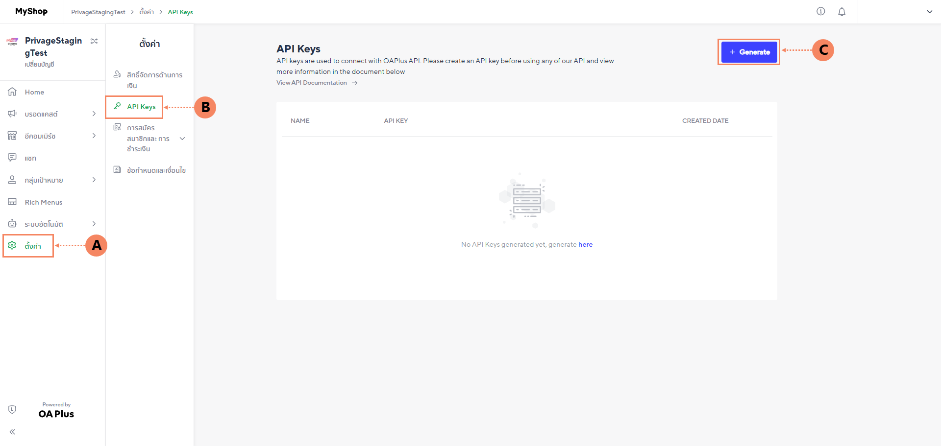 2.3 เลือกเมนู ตั้งค่า (A) , API Keys (B) จากนั้นกดปุ่ม "+ Generate" (C)