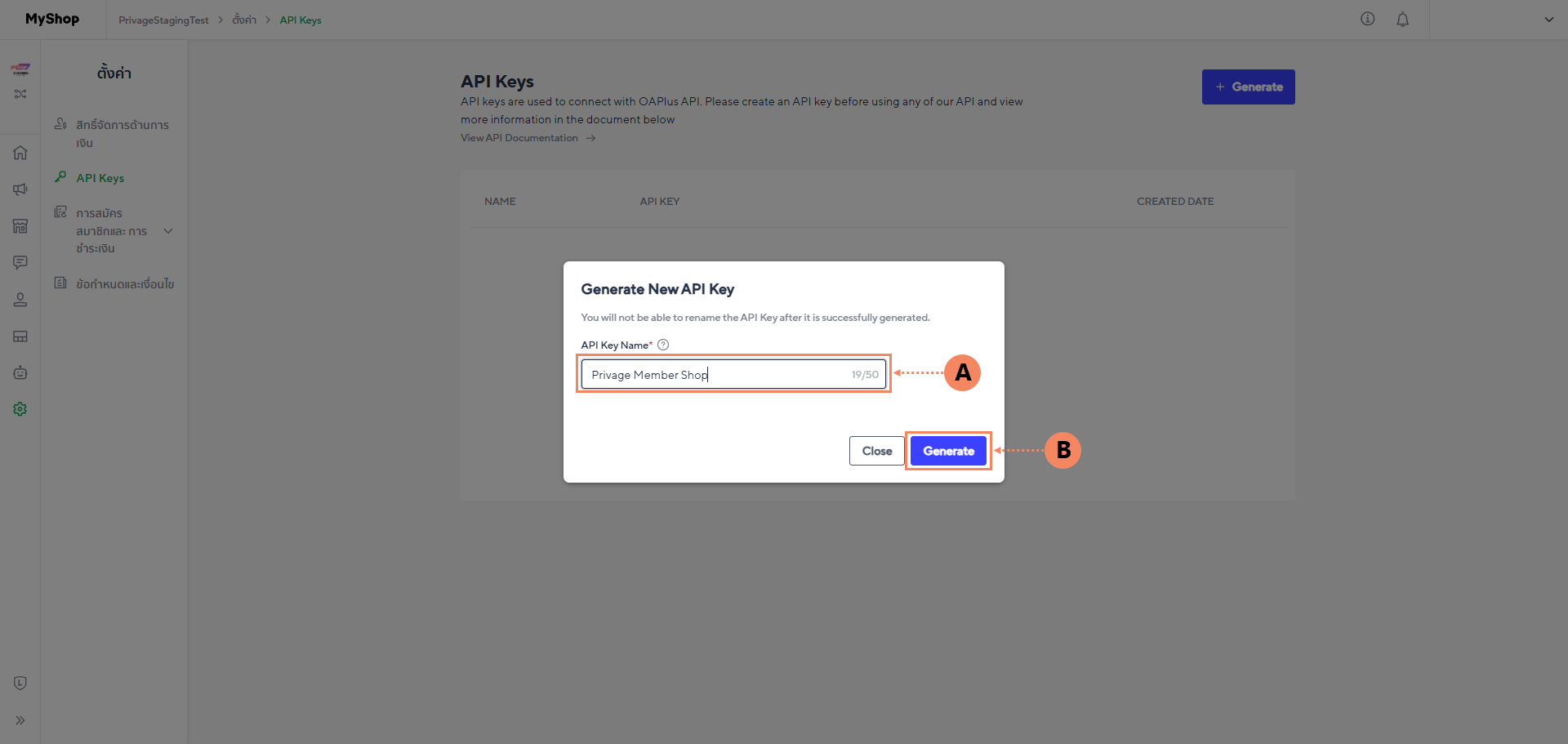 2.4 กำหนดชื่อ API ในช่อง API Key Name (A) จากนั้นกดปุ่ม Generate (B)