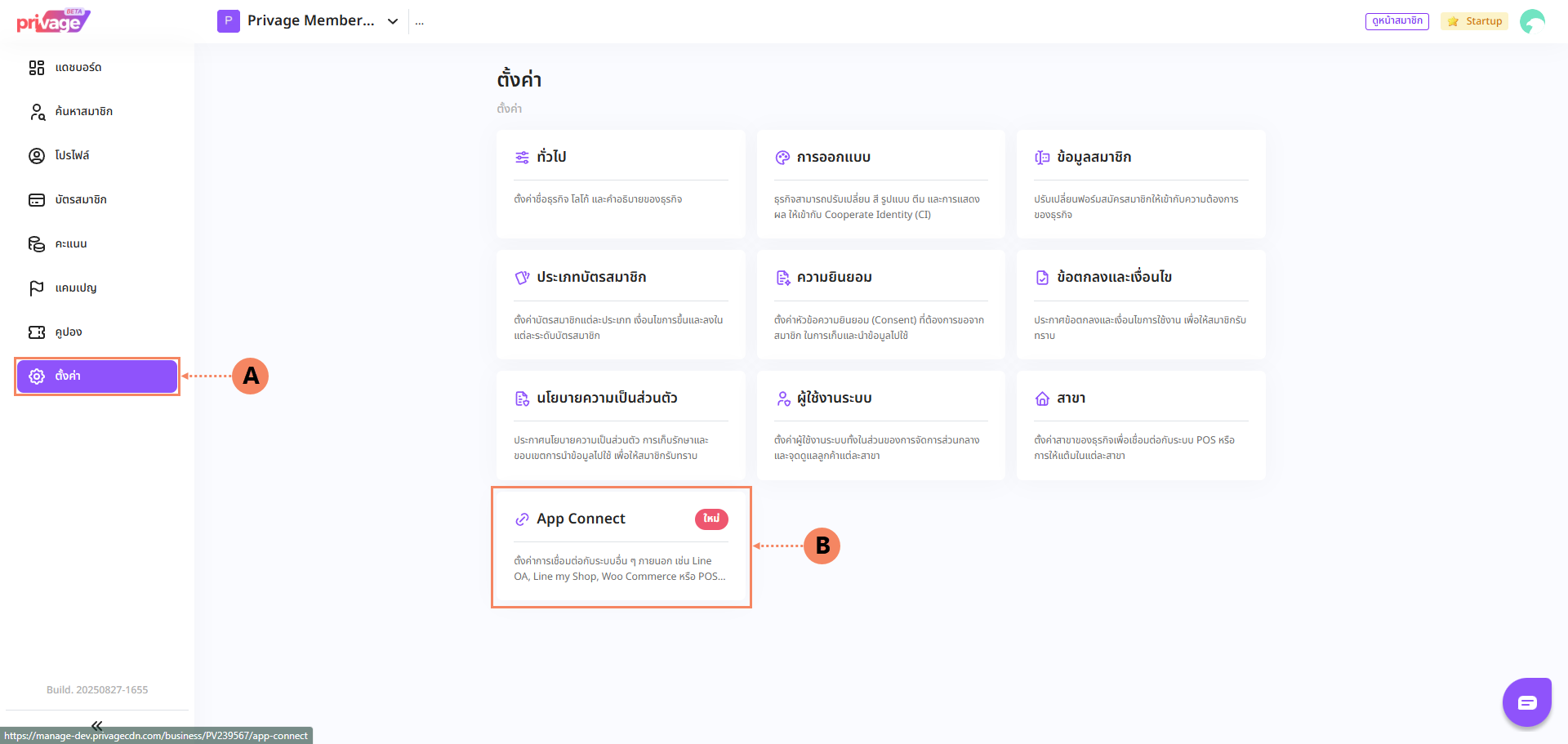 3.1 เข้าธุรกิจที่ต้องการติดตั้ง Line MY Shop เลือกเมนู ตั้งค่า (A) จากนั้นเลือก APP Connect (B)