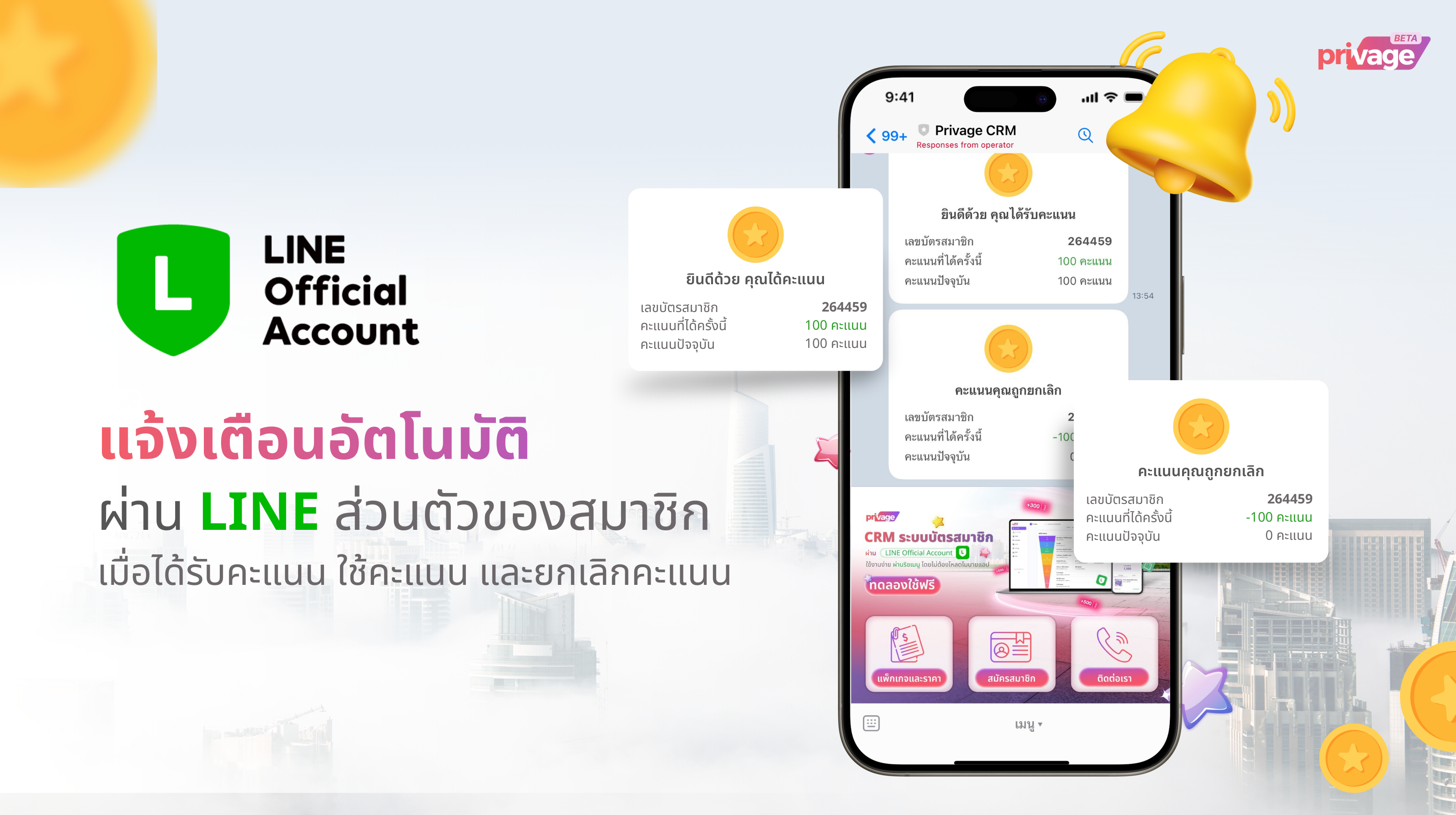 LINE OA Notification จะทำให้สมาชิกได้รับการแจ้งเตือนต่างๆจากระบบแบบส่วนตัว ช่วยย้ำเตือนถึงสิทธิประโยชน์ รวมถึงสร้างปฏิสัมพันธ์ระหว่างสมาชิกกับแบรนด์อย่างเป็นระบบ โดยธุรกิจสามารถตั้งค่าได้ว่าต้องการให้ส่งในกรณีใดบ้าง และโควต้าในการส่งจะหักออกจาก Line OA Broadcast message ได้แก่
