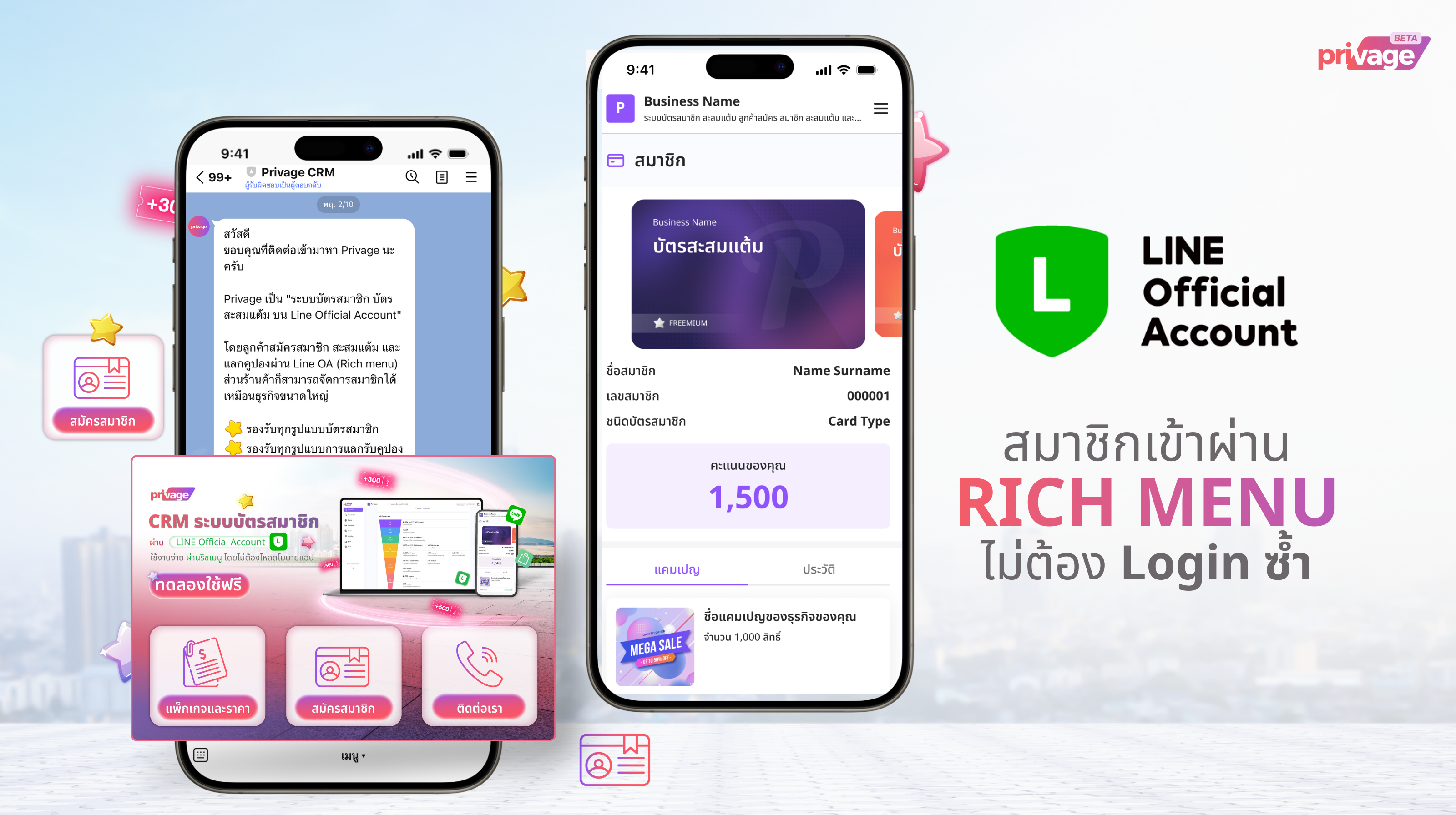 LINE OA Richmenu เป็นแอปฯ ที่จะช่วยเชื่อมต่อระบบ CRM ของธุรกิจเข้ากับ Line อย่างสมบูรณ์ สมาชิกสามารถเข้าสู่ระบบผ่าน Rich Menu ของ Line OA โดยไม่จำเป็นต้อง Login ซ้ำ เปลี่ยน Line OA ของธุรกิจให้เป็นช่องทางหลักในการเข้าถึงข้อมูลต่างๆของสมาชิกและลูกค้าประจำ เช่น