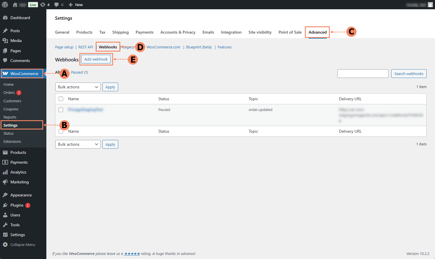 3.2 เลือก WooCoomerce (A) → Settings (B) → Advanced (C) → Webhooks (D) → Add webhook (E)