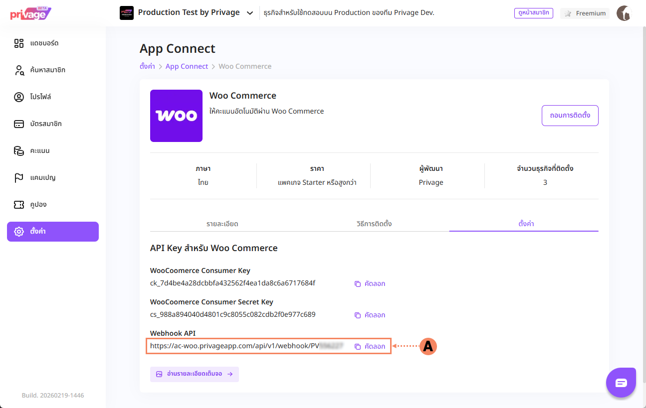 2.5 ระบบ Privage จะทำการติดตั้ง WooCoomerce และสร้าง Webhook API (A) ให้ทำการคัดลอก Webhook API เพื่อทำไปติดตั้งบน WooCoomerce ในขั้นตอนถัดไป