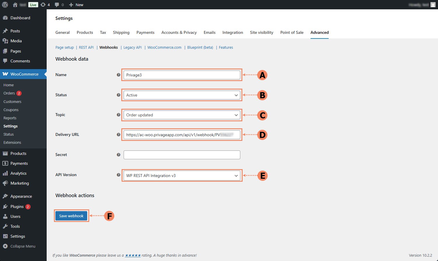 3.3 กำหนดชื่อของ Webhook ในช่อง Name (A) → เลือก Status เป็น Active (B) → เลือก Topic เป็น Order Update (C) → นำ Webhook Url จากระบบ Privage มาใส่ในช่อง Delivery URL (D) → เลือก API Version เป็น WP REST API Integration v3 (E) → จากนั้นกดปุ่ม Save Webhook (F) เสร็จสิ้นขั้นตอนการติดตั้ง
