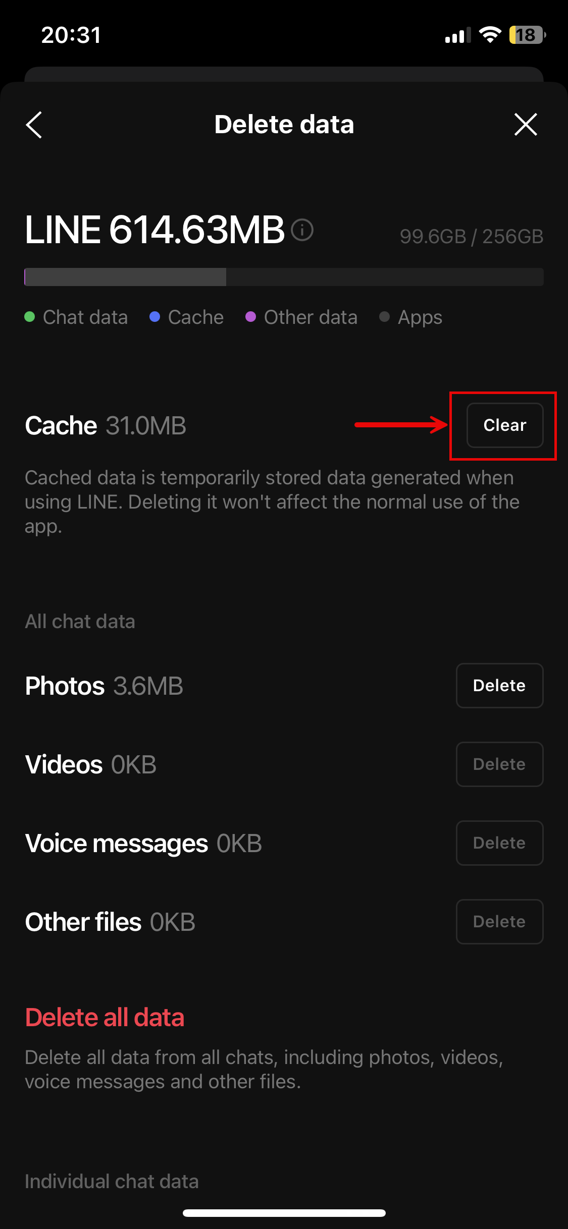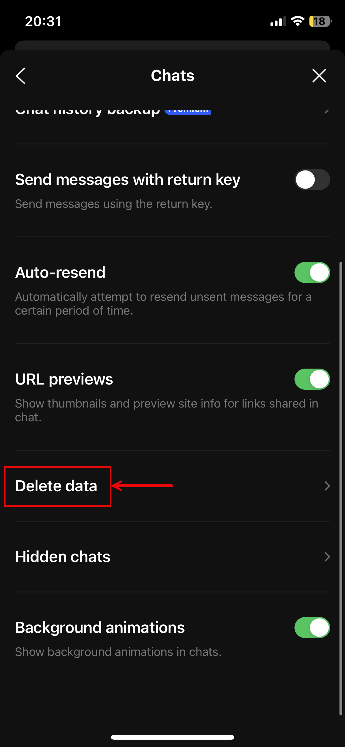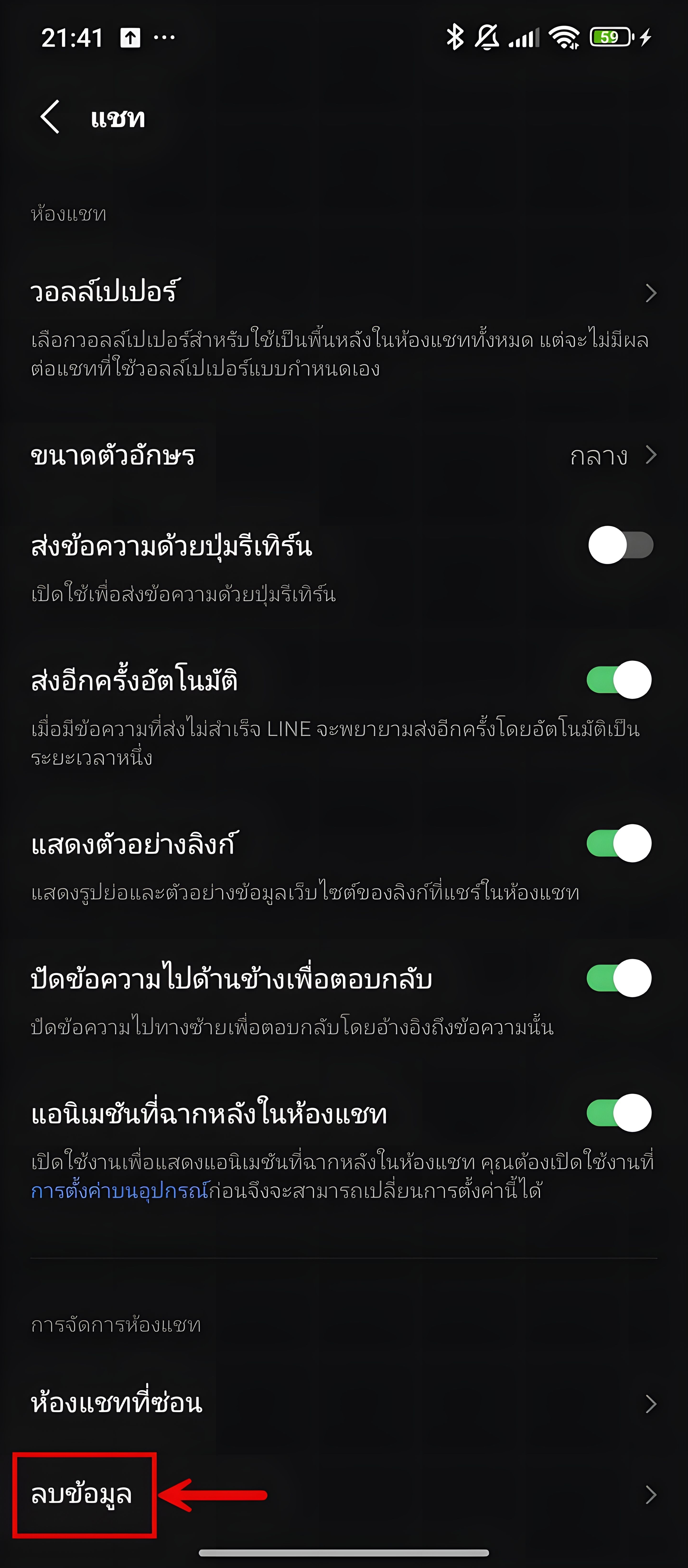 2.4 เลื่อนลงจากนั้นเลือก "ลบข้อมูลการแชท" (Delete Data)