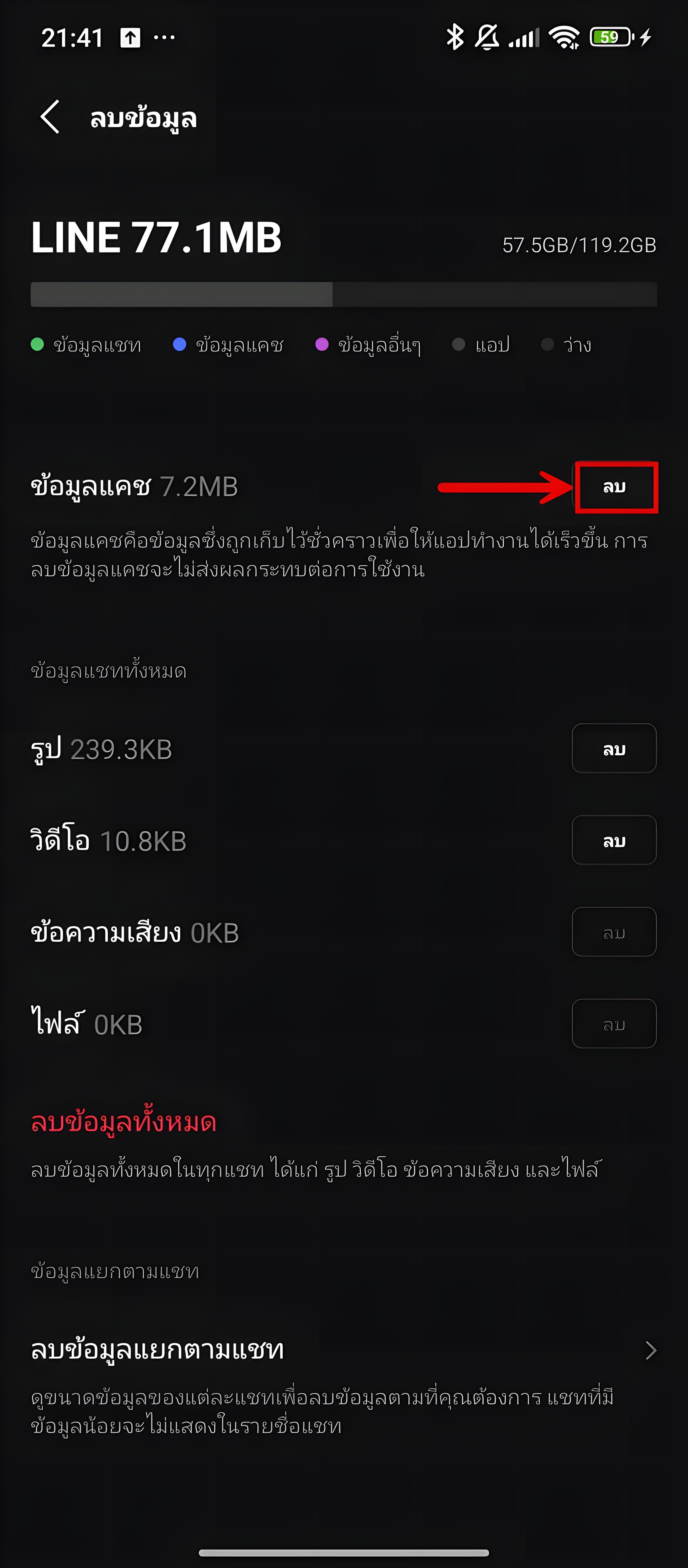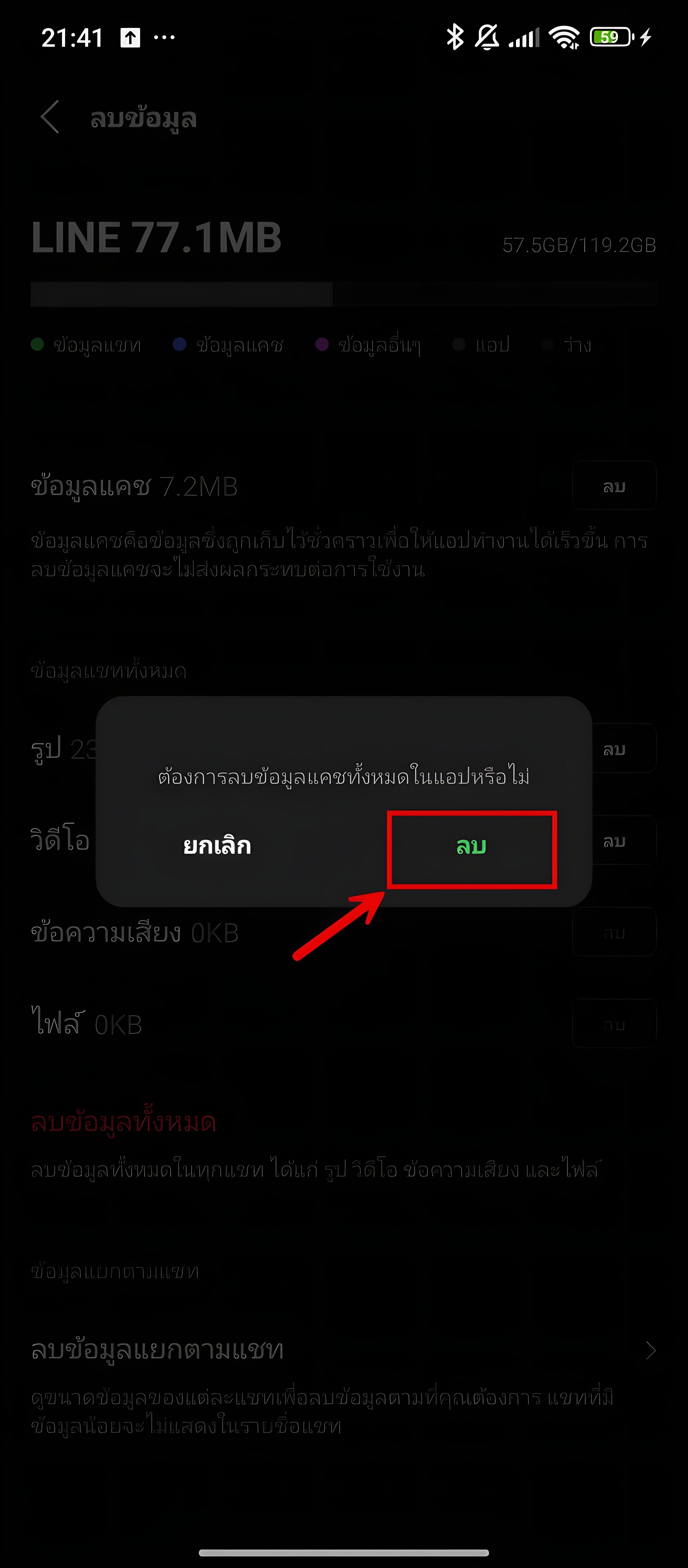 2.6 เลือก ลบ เพื่อยืนยันการลบข้อมูลแคชทั้งหมดในแอป
