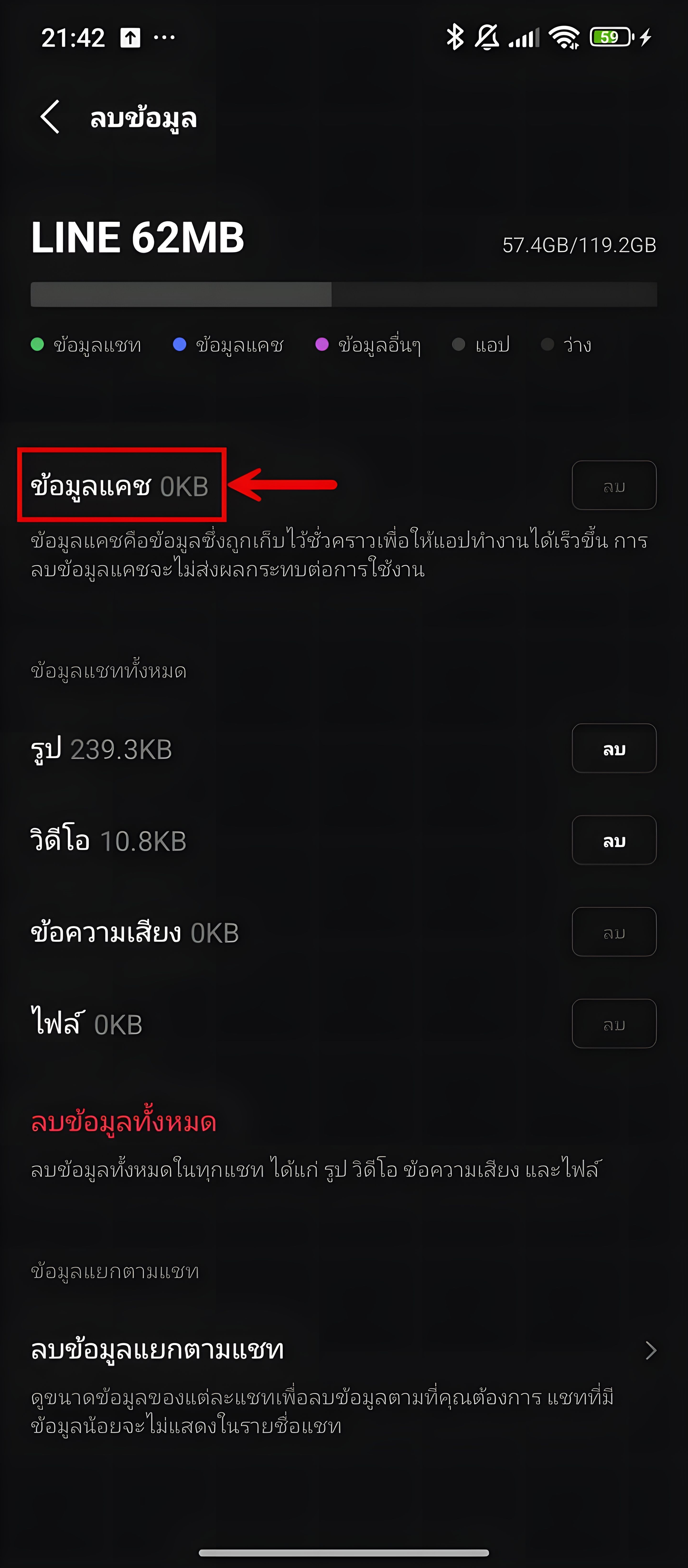 2.7 หลังจากลบแคชแล้ว ข้อมูลแคช (Cache) จะเป็น 0 KB ให้ลองเปิดแอปหรือเว็บไซต์จาก LINE อีกครั้ง หากยังพบปัญหา แนะนำให้ลองปิด-เปิด LINE หรือรีสตาร์ทเครื่องเพิ่มเติม