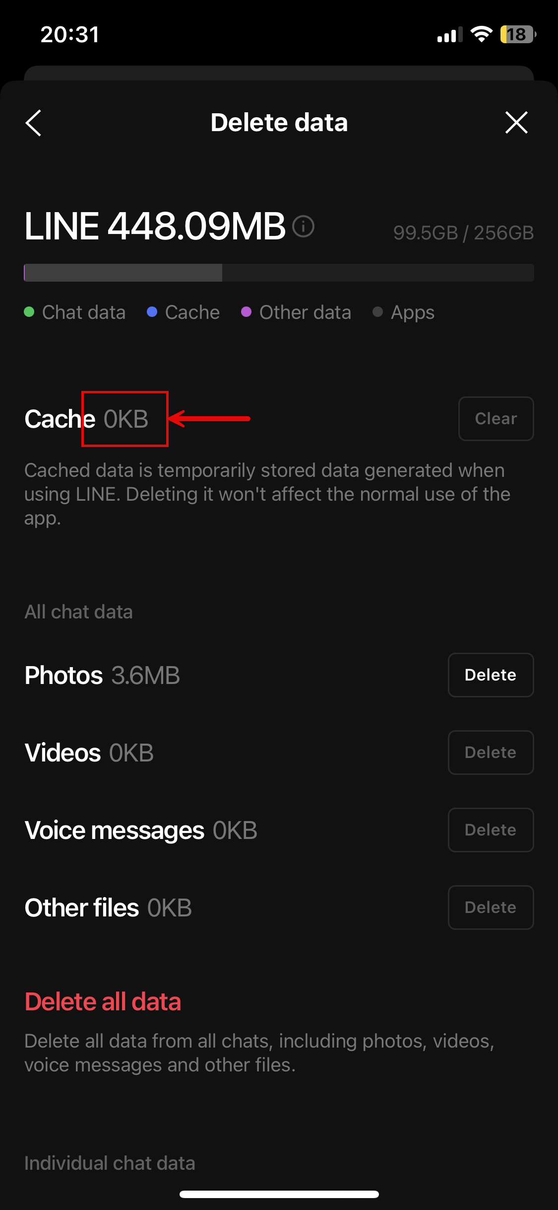 1.6 หลังจากลบแคชแล้ว ข้อมูลแคช (Cache) จะเป็น 0 KB ให้ลองเปิดแอปหรือเว็บไซต์จาก LINE อีกครั้ง หากยังพบปัญหา แนะนำให้ลองปิด-เปิด LINE หรือรีสตาร์ทเครื่องเพิ่มเติม